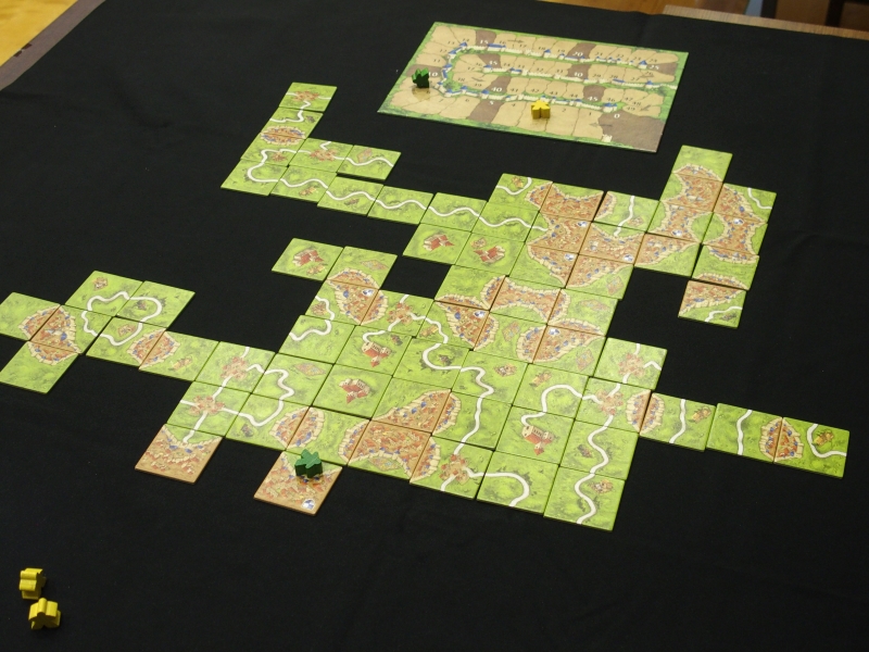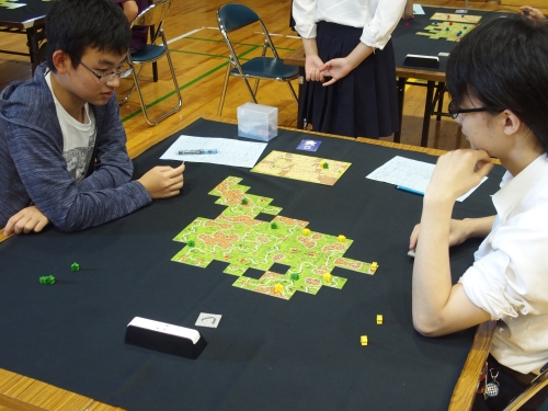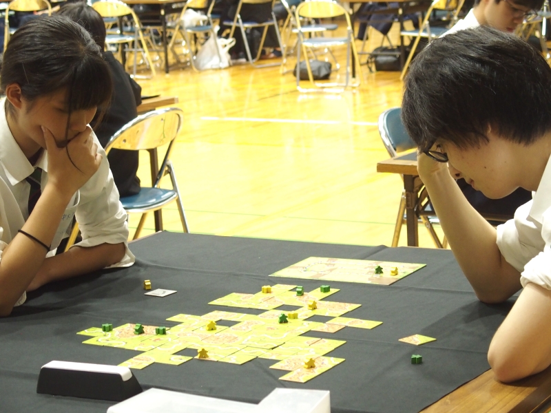 カルカソンヌの予選では100点以上の差がついた勝負もあり、終了後の感想戦が盛り上がっていました。差をつけた生徒は最後のタイルの引きに喜び、負けた生徒は何も言葉がでないといった感じです。100点以上の差は、私でも見たことがありませんでした。こういったドラマチックな展開も真剣勝負ならではでしょうか?