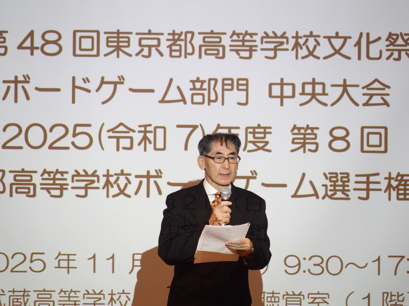 会長の生田先生からは、高文連に加盟したことでボードゲームの大会は囲碁や将棋の大会と同等であること。他流大会は実力が試される機会であり、団体戦とはいえ個人の力を駆使して勝利を目指すこと。そして大会をスムーズに進行する上で協力してくれるスタッフたちに尊敬と感謝の念をもつというお話がありました。