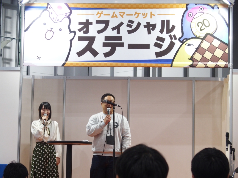 正午から始まるゲームマーケット大賞表彰式を観覧すべく、Bホールの端まで足早に向かいます。途中、知り合いのサークル前で呼び止められたり立ち寄ったりしていると、あっという間に時間は過ぎていくのです。