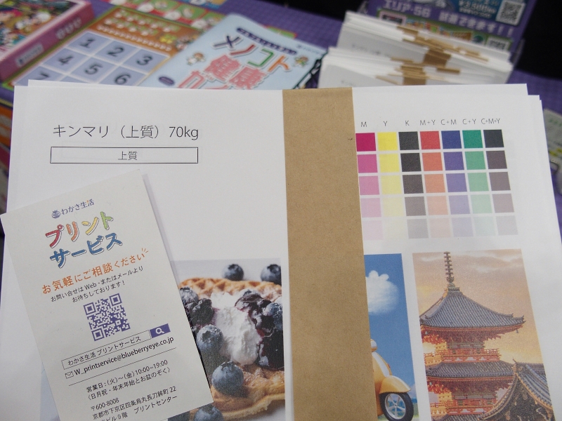 印刷も手掛けているということで紙のサンプルをいただき、さらに制作したボードゲームも展示されています。
