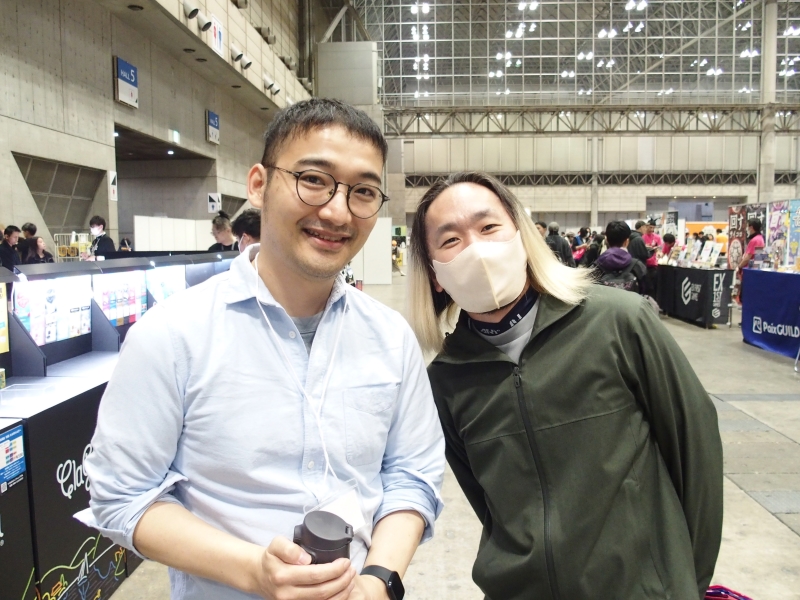 今回、最後に写真を撮らせていただいた角刈書店氏とメンマ氏。皆さん出展していたり、ブースを手伝ったりしているので、ゆっくり話せる時間は貴重です。