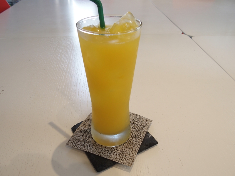 バナナ1本を丸ごと使ったバナナミルクと冷えたオレンジジュースです。外とは違い快適な室内でいただくドリンクは最高においしい。