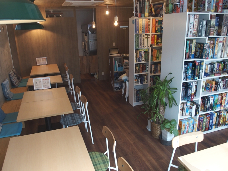 店内はL字になっていて、ボードゲームの棚は中央付近に集まっています。もちろん、並ぶボードゲームは店内で遊ぶことができます。