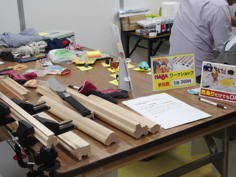 キッズゲームの老舗HABAのワークショップは、実際に木製のコマをのこぎりで切り出し、さらにその場で着色できるというもの。